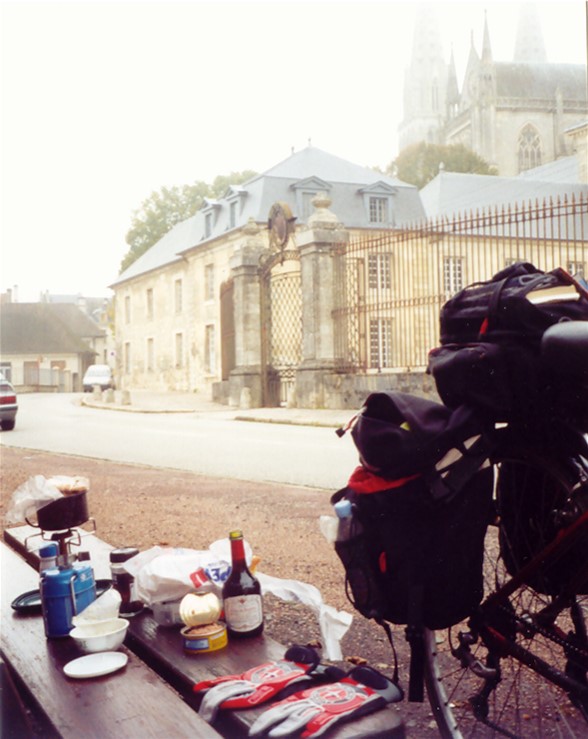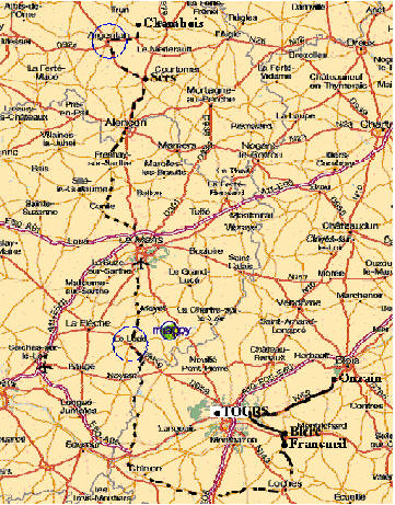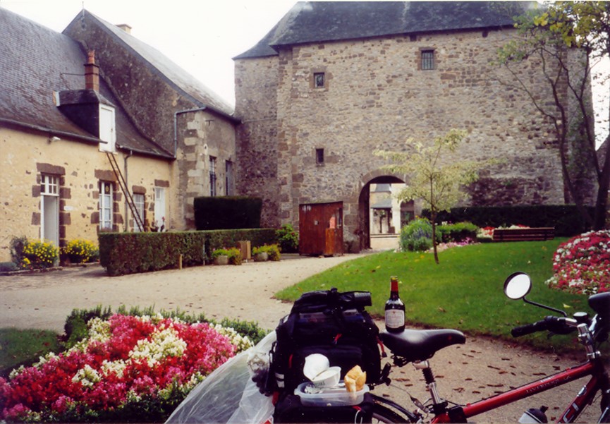 12 octobre À 9 h, au moment de quitter le camping, une surprise m’attend: une crevaison au pneu arrière. Je dois enlever l’ensemble des sacoches, démonter le pneu et identifier le trou à peine gros comme la pointe d’une épingle. Je vérifie l’intérieur du pneu, tout me semble beau; je répare le tube, je replace le tout, etc. Et je repars tout confiant d’un travail bien fait. Je n’ai pas fait 5 km que je sens le même pneu se dégonfler; le ciel est à la pluie, quelques gouttes tombent; heureusement, je suis près d’une ferme et le fermier, d’une soixantaine d’années, travaille dehors; je lui demande de m’installer dans le hangar tout ouvert. Pas de problème, je refais le même travail que le matin, examine plus à fond l’intérieur et l’extérieur du pneu et je vois bien une fine pointe de métal dans le pneu qui, sous la pression, entrait perforer le tube; je remplace le tube par un neuf de rechange. Entre temps, le ciel se dégage et je continue ma route vers Alençon à travers de belles petites communes très anciennes, non retapées, dont Fresnay-sur-Sarthe qui restera un de mes beaux souvenirs. J’ai dîné là dans le jardin du château (10e siècle) qui surplombe la Sarthe et sa vallée. 	 J’arrive à Alençon vers 14 h 30. Je passe devant un commerçant de vélos et j’en profite pour faire gonfler mes pneus. Je me rends par la suite à la poste pour correspondre par Internet. J’avais, la veille, en passant par Le Mans, acheté une carte au coût de 50 FF, qui me donne le droit à 1 h 30 d’usage Internet ; j’en avais utilisé au Mans 30 minutes. Mais, tout en verrouillant mon vélo près du bureau de poste d’Alençon, je fais la connaissance d’un agent de contravention. On parle un peu de tout et du but qui m’amène à la poste. Il m’informe que, dans une annexe de la mairie, à 5 minutes de marche, une dizaine de postes Internet sont mis à la disposition de la population, et ce, gratuitement. Je suis son conseil ; ainsi je peux réserver à 16 h 45 un 45 minutes de communication ; en attendant, je me rends à l’Office du tourisme et j’erre dans les rues piétonnes. À 17 h 30, je m’attarde encore un peu au centre-ville avant de me rendre au camping de Quéramé sur le bord de la Sarthe, à peine à 5 minutes de vélo du centre-ville.