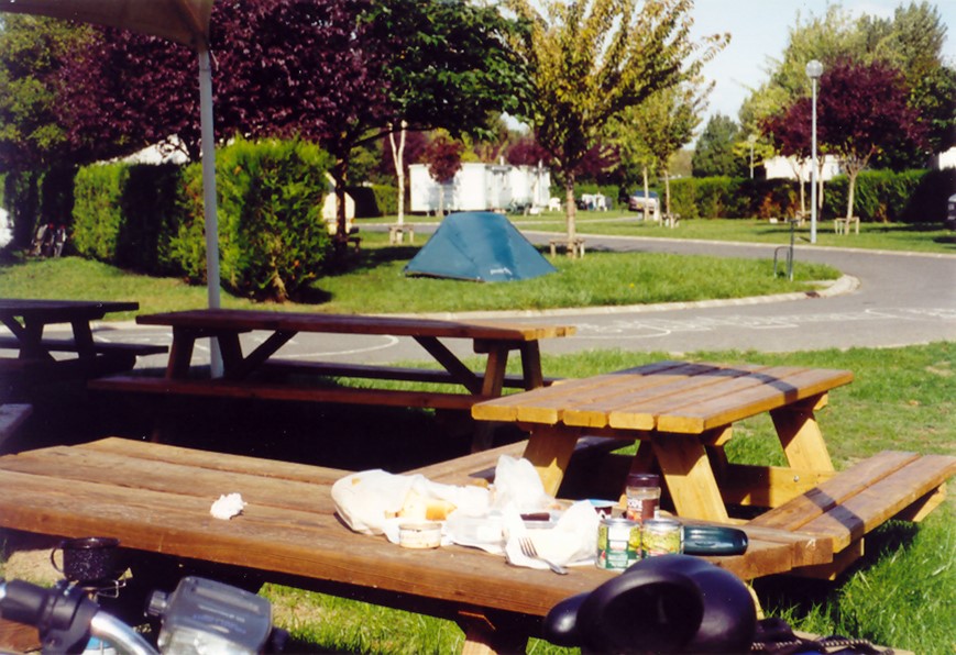 À Bléré, sur le bord du Cher, je prends le temps de dîner avec les restes de mon souper d’hier soir. J’arrive donc chez les H. à 14 h30 sous un soleil radieux ; il fait 18e au soleil. Heureusement, la porte d’entrée sur la propriété n’est pas fermée à clef : un autre indice qui me laisse espérer qu’ils soient absents temporairement. J’étends la toile de ma tente pour la faire sécher ; je la plie toute mouillée chaque matin; j’en profite pour nettoyer le polythène avec un boyau que je trouve près du cabanon. Puis, j’attends, installé à la table devant l’entrée principale. Je lis le 2e tome des Rois maudits. À l’occasion, je vais faire une marche dans la rue des Sources; je reconnais vaguement la maison chez qui nous avions été en 1987, mais la rue demeure déserte jusqu’à 18 h, alors qu’arrivent M et Mme M. qui demeurent en face, l’autre côté de la rue. Je vais me présenter, ne serait-ce que pour éliminer toute ambiguïté. Ils m’informent que F. et D. sont partis depuis plus de deux mois et qu’ils ne savent pas quand ils reviendront. Ils se montrent très accueillants et m’offrent de répondre à mes besoins éventuellement. J’installe donc ma tente sur le gazon avant de souper.