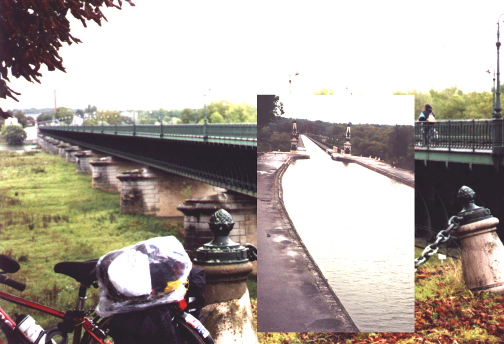 2 octobre Il a plu cette nuit; ce matin, c’est nuageux; il est 8 heures, je fais ma toilette et je file sur Gien. Il est 10 h 05, je dépose à Léré une lettre pour la famille. Je suis à 32 km de Gien où je coucherai; pas encore de pluie. La route est extraordinaire longeant toujours le Canal latéral de la Loire. Quitter le Cher pour entrer dans le Loiret, c’est quitter la plaine pour les collines, du moins jusqu’à Briare où je suis arrivé à 13 h. Tout en dînant, debout sous l’abri d’une ancienne station d’essence, je revêts pour la première fois mes habits de pluie. À Briare, c’est le pont d’eau pour faire passer le canal latéral de la rive nord à la rive sud de la Loire qui frappe l’imagination: du jamais vu.